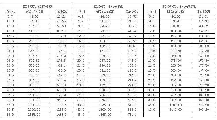2、破断负荷为纤维芯FC钢丝破断拉力总和,金属芯IWR钢丝破断拉力总和≈纤维芯的1.08倍,钢丝破断拉力总和=钢丝绳最小破断拉力X1.283。